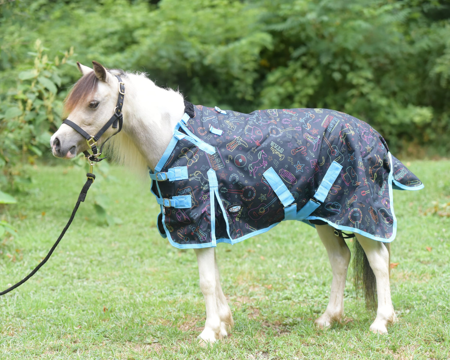 Add some neon glow to your horse’s wardrobe with this colorful Nashville Nights print! This blanket is made of a 1200 denier waterproof ripstop outer shell with 250 grams of poly fill for warmth. It is designed with a Tough1® Snuggit™ strap which offers a more adjustable fit around the neck. The large shoulder gussets allow the horse freedom of movement and three dee rings at the neck offer optional neck cover attachment. The double buckle front closure design includes removable snaps and a “Quick Grip” tab for extra security. Other features include: fleece wither protection, tail flap, crossed surcingle straps with elastic ends, and adjustable/replaceable elastic leg straps.