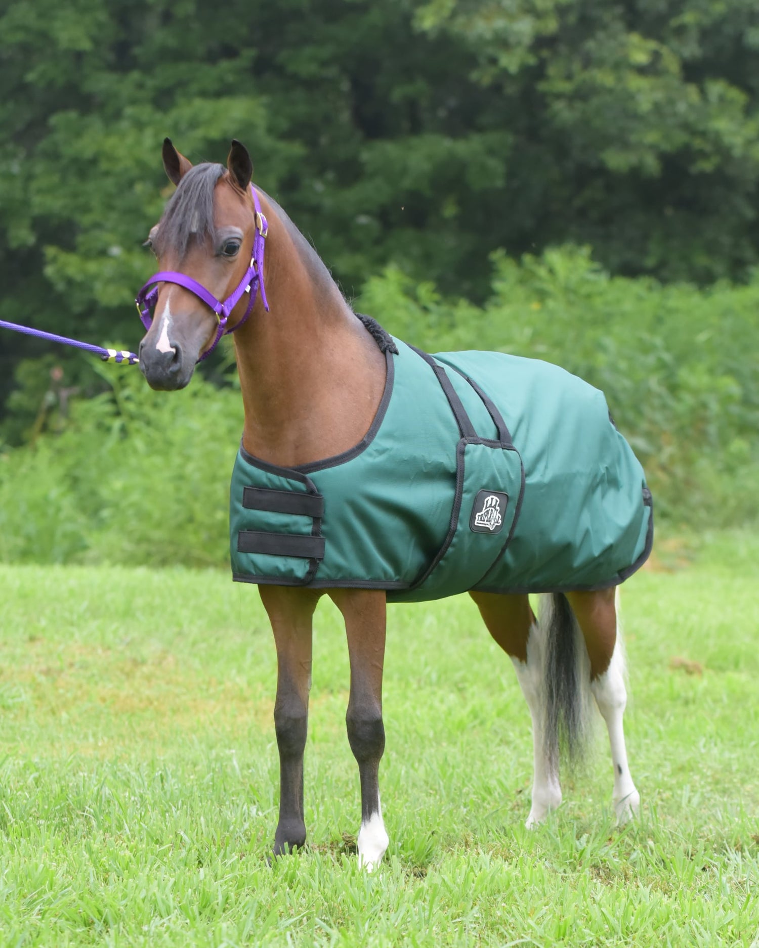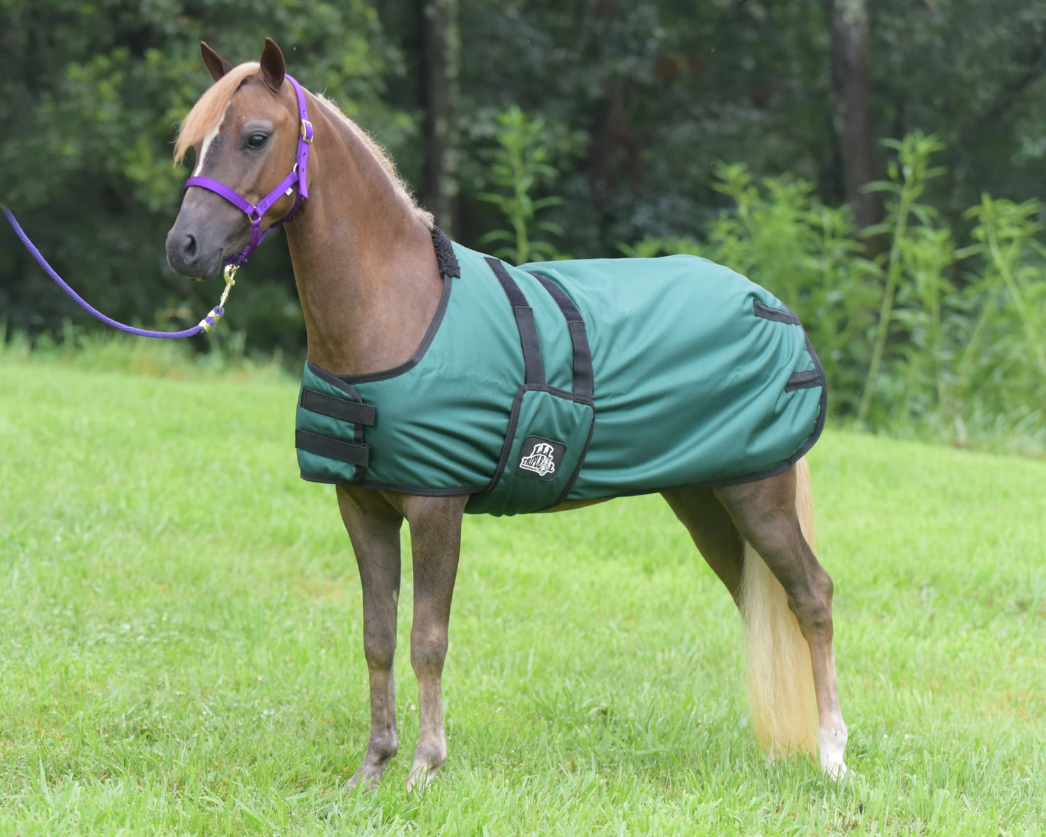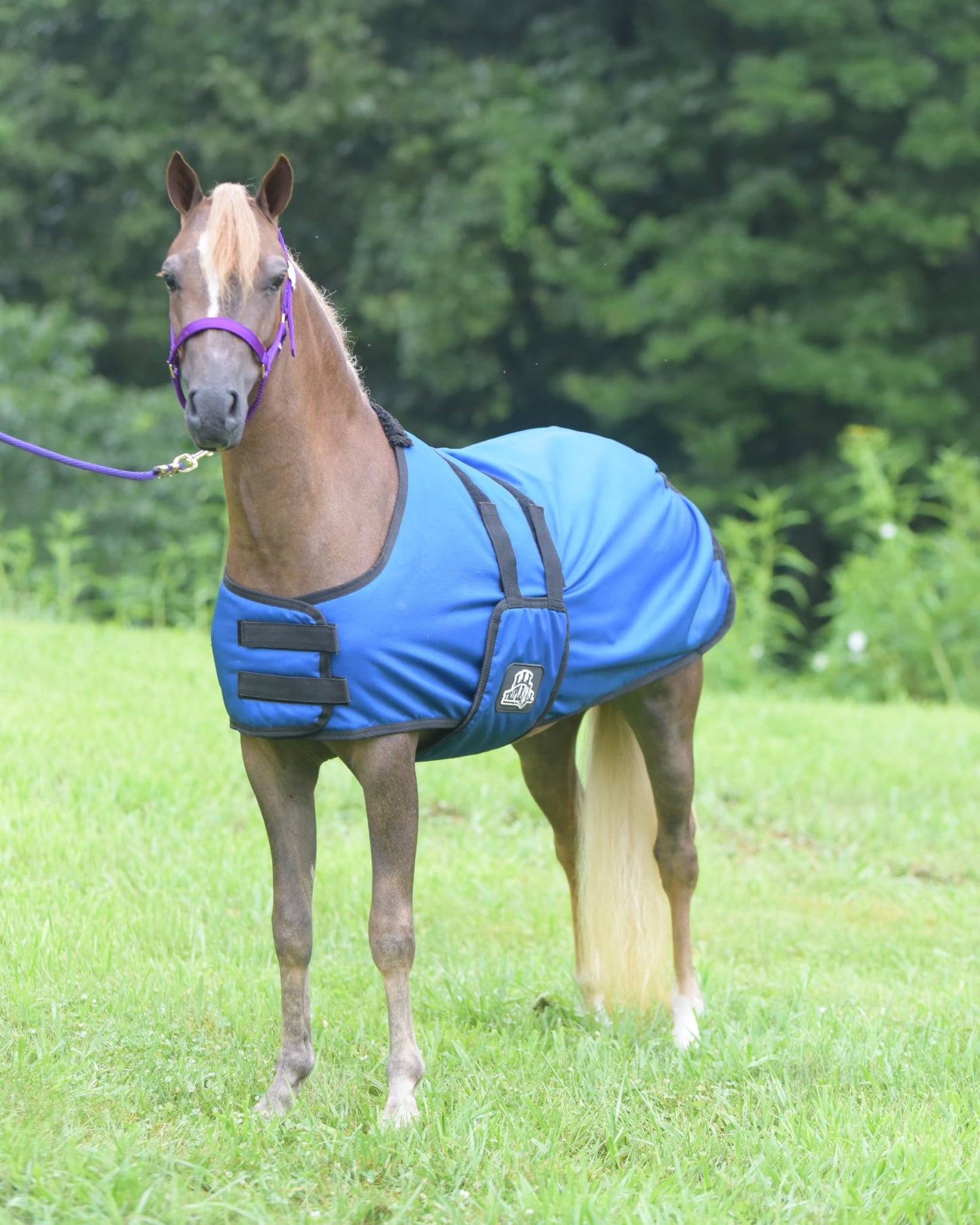 Keep your miniature horse warm and comfortable with our Miniature Belly Wrap Blanket. Crafted from 1680 denier outer material, insulated with 100g polyfill and lined with 70 denier fabric for maximum comfort. This blanket features a secure belly wrap with "Quick Grip" closures for easy on-and-off, along with an adjustable double front closure for a snug fit. A generous tail flap offers extra coverage, and fleece wither protection helps prevent rubbing and discomfort.