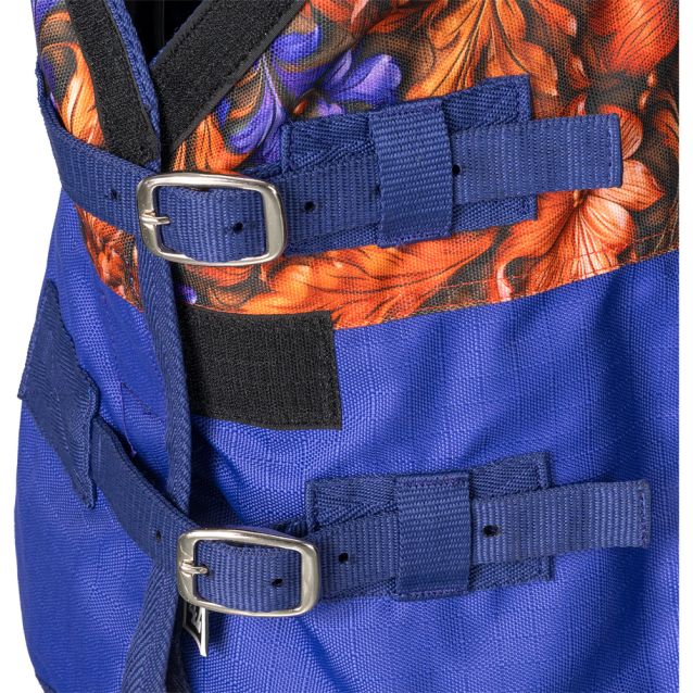 Fancy copper carved florals meet bold jewel tones for a unique western inspired print! This sheet is made of a 1200 denier waterproof ripstop outer shell and features the Tough1® Snuggit™ strap, offering a more adjustable fit around the neck. The large shoulder gussets allow the horse freedom of movement and three dee rings at the neck offer optional neck cover attachment. The double buckle front closure design includes a “Quick Grip” tab for extra security. Other features include: fleece wither protection, tail flap, crossed surcingle straps with elastic ends, and adjustable/replaceable elastic leg straps.