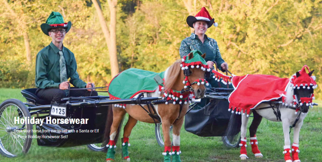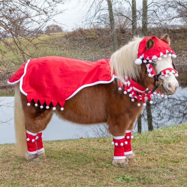 Includes: quarter sheet, 4 leg wraps, 2 rein covers, Santa hat, 3-piece halter cover set